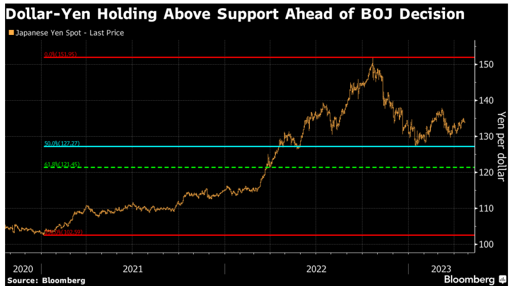 O nível de 120 pontos indicado pelo UBS situa-se à volta dos 61,8% de retracção Fibonacci da onda ascendente iniciada em 2020. O par teria primeiro de romper abaixo dos 50%, perto dos 127 pontos. Antes da decisão do BoJ, o USDJPY ainda está a negociar bem acima do suporte determinado pelo fibo mais próximo. Fonte: Bloomberg