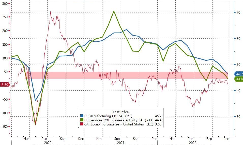 Os números do PMI de hoje são outro sinal de recessão potencial. Fonte: Bloomberg via ZeroHedge