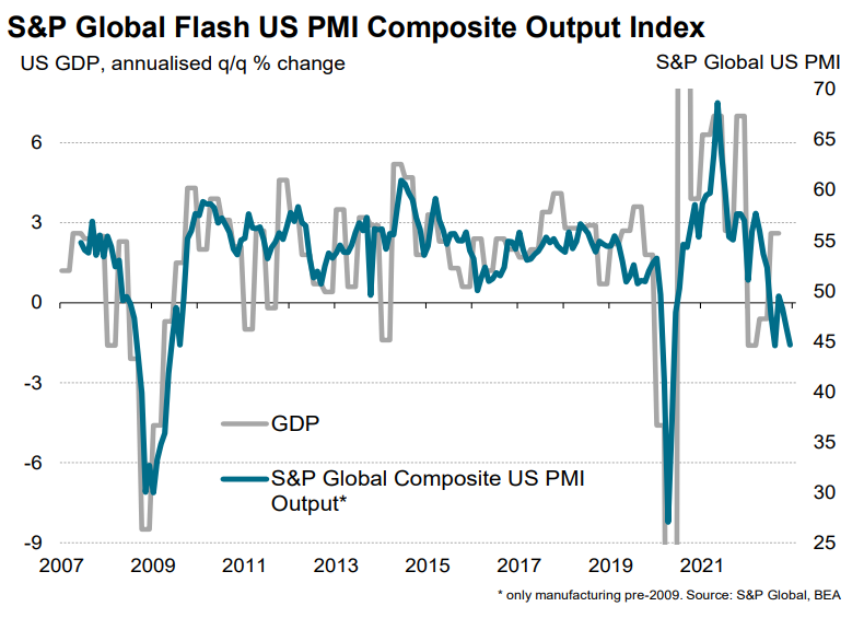 “As condições de negócios estão a piorar à medida que 2022 chega ao fim, com uma queda acentuada no PMI indicativo de contração do PIB no quarto trimestre a uma taxa anualizada de cerca de 1,5%. Enquanto isso, o crescimento de empregos desacelerou, à medida que as empresas de manufatura e serviços adotam uma abordagem muito mais cautelosa para contratar com a queda na procura dos clientes", disse Chris Williamson, economista-chefe de negócios da S&P Global Market Intelligence. Fonte: S&P Global