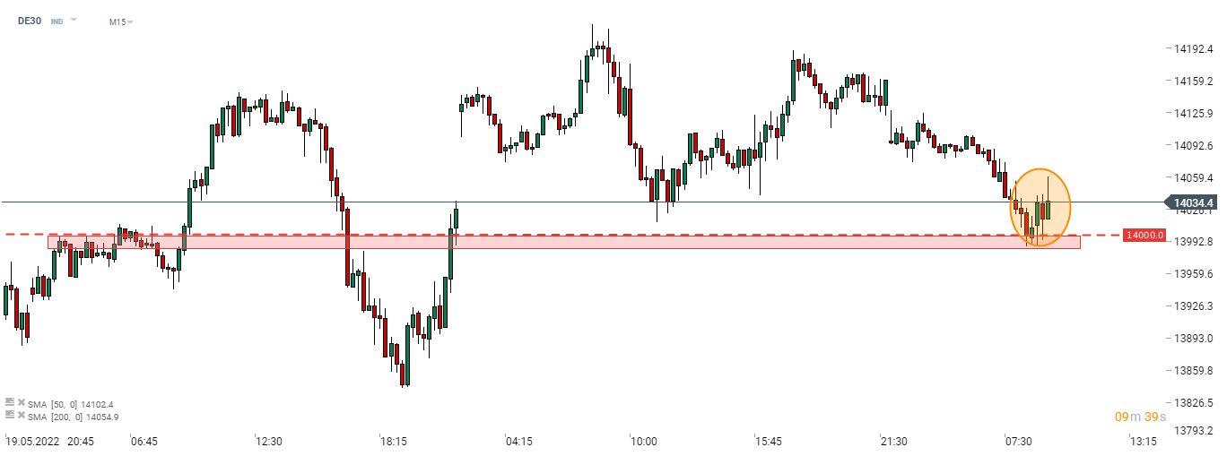 DE30 tenta permanecer acima da zona de suporte marcada pelos 14.000 pts. Fonte: xStation5