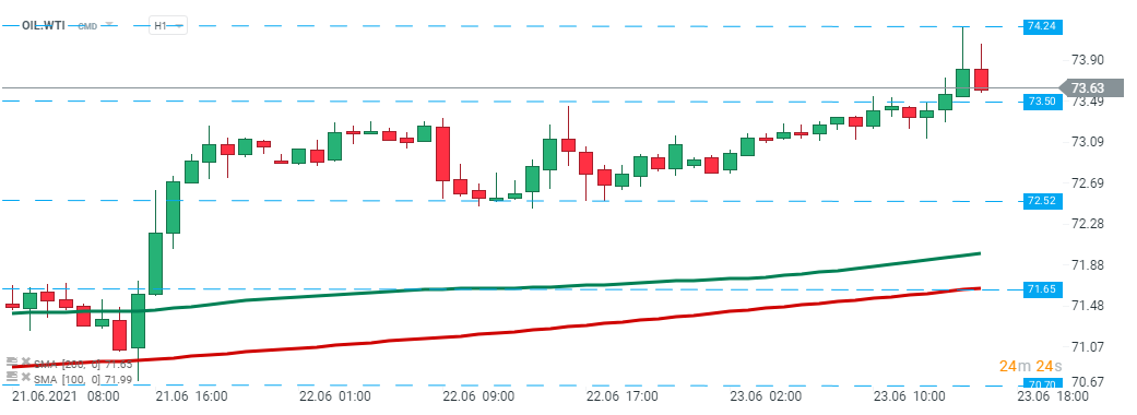 O preço do petróleo (OIL.WTI) caiu após a divulgação do relatório da EIA e aproxima-se da marca dos 73,50$. Fonte: xStation5