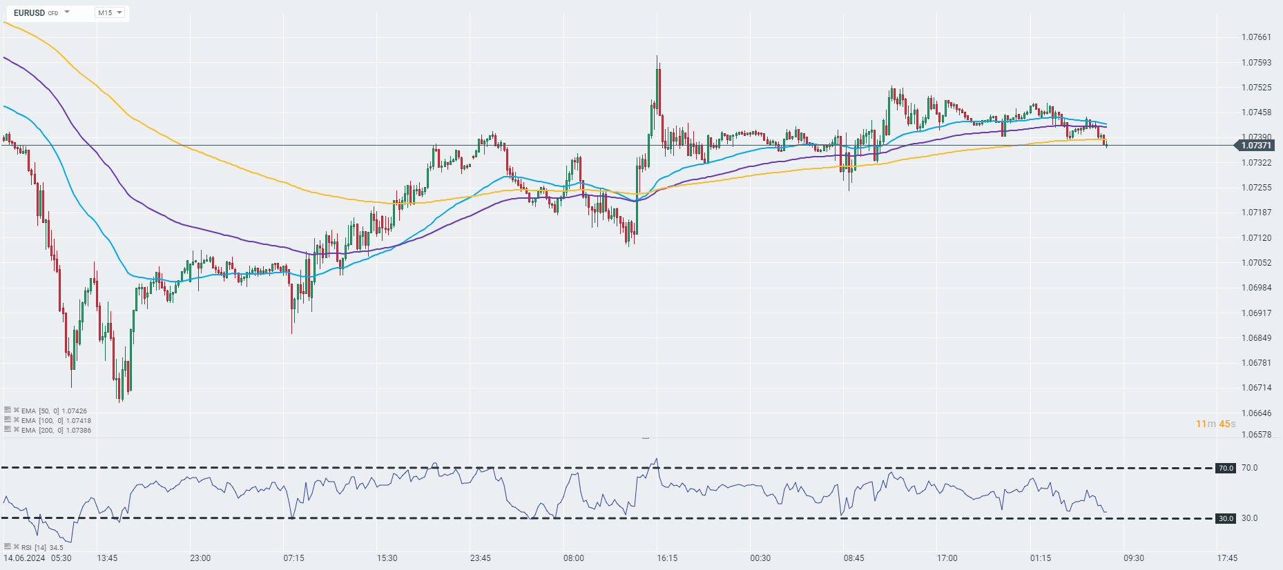O par EURUSD perde minimamente após a leitura dos dados e quebra abaixo da EMA de 200 períodos no intervalo M15. Fonte: xStation