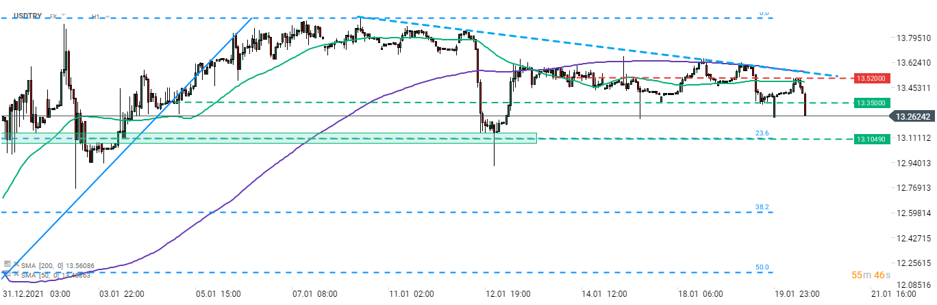 Analisando o gráfico do par USDTRY através do intervalo de H1, podemos ver que o par reagiu em baixa e está a aproximar-se da marca dos 13,11, que coincide com os níveis de Fibonacci nos 23,6%.