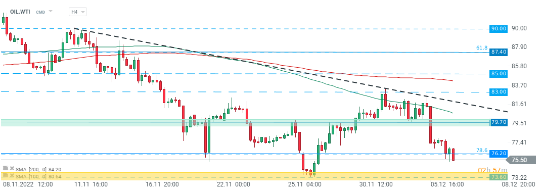 OIL.WTI continua a cair e durante a sessão de hoje os vendedores conseguiram fazer com que o preço quebrasse abaixo da marca dos 76,20 dólares, junto dos níveis de Fibonacci nos 78,6%. Se os vendedores conseguirem manter o controlo do preço, o movimento de baixa poderá prolongar-se em direção à marca dos $73,60. Fonte: xStation5