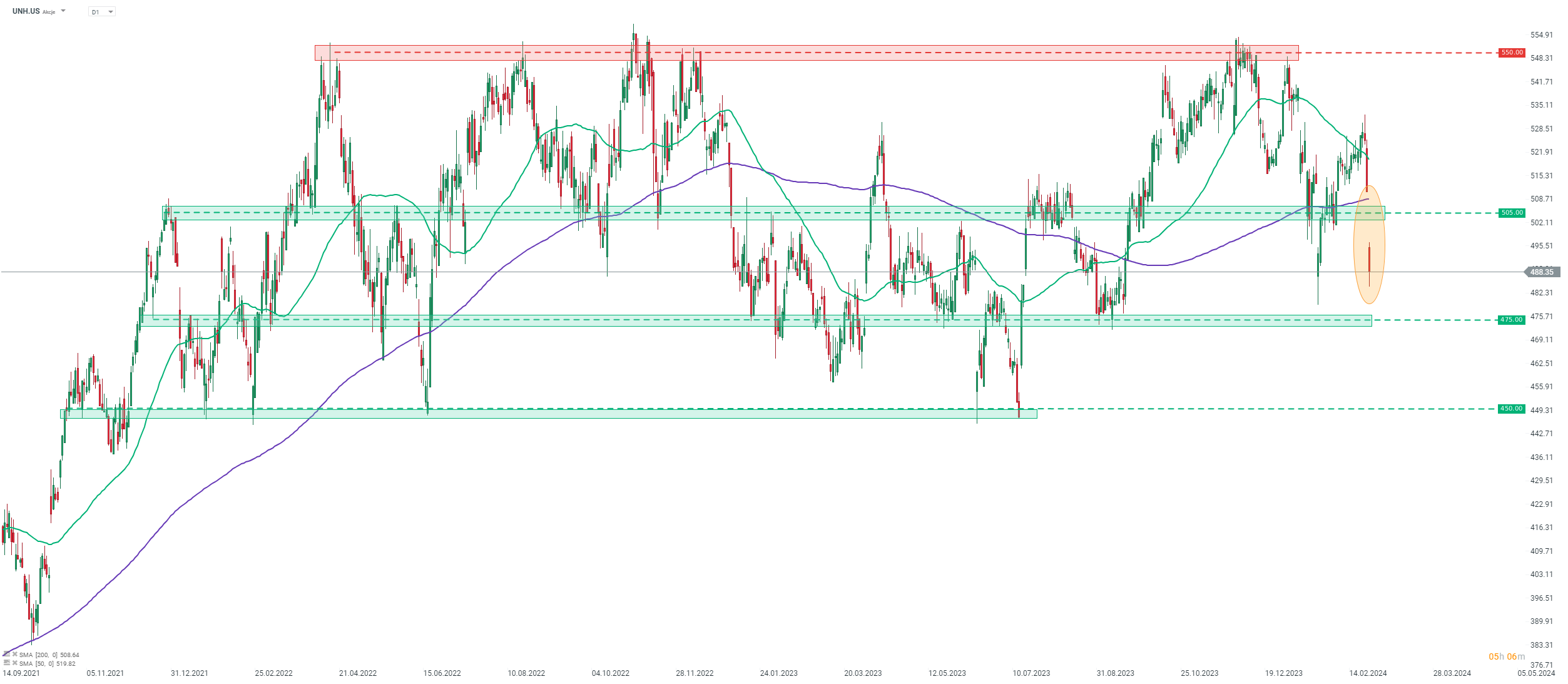 Dando uma olhada no gráfico da UnitedHealth (UNH.US) no intervalo D1, podemos ver que a ação está caindo abaixo da média móvel de 200 sessões (linha roxa) e da zona de suporte de $ 505 hoje. As ações estão sendo negociadas no nível mais baixo desde 24 de janeiro de 2024. A zona de suporte de curto prazo a ser observada, caso as quedas continuem, pode ser encontrada na área de $ 475.