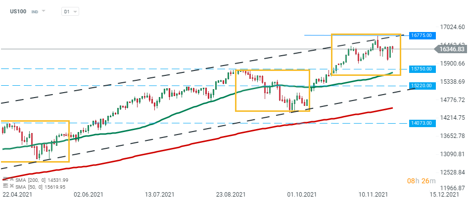 US100 atingiu um novo máximo histórico perto dos 16775 pts na semana passada, no entanto, os compradores não conseguiram manter o controlo do preço e o índice regressou abaixo do limite superior do canal ascendente. Se os vendedores conseguirem manter o controlo, então a zona de suporte perto dos 15.750 pts, que é marcada pelo limite inferior da estrutura, pode estar em risco. Fonte: xStation5
