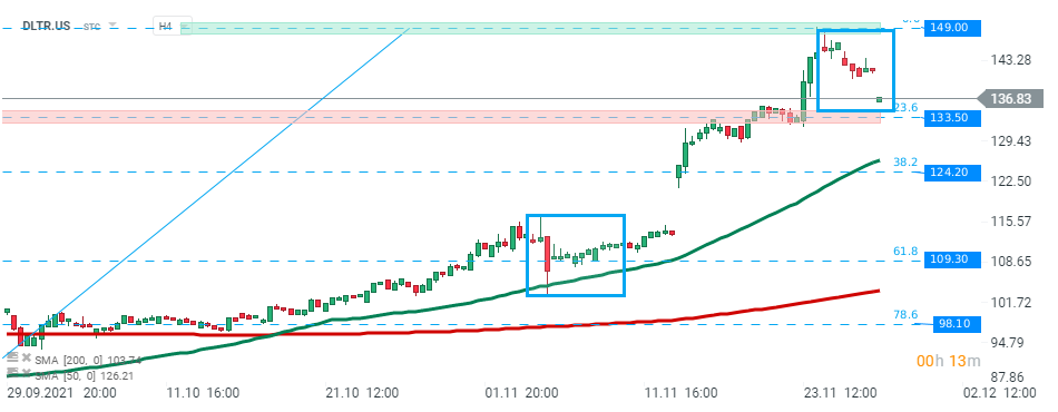 As ações da Dollar Tree (DLTR.US) começaram a sessão de hoje em baixa e aproximam-se da zona de suporte nos $133,50 que coincide com o limite inferior da estrutura e dos níveis de Fibonacci nos 23,6%. Se ocorrer uma quebra abaixo dessa zona, o movimento de descida poderá intensificar-se em direção à marca dos $124,20 que coincide com a SMA de 50 períodos (linha verde) e com a retração de Fibonacci nos 38,2%. Por outro lado, se os compradores conseguirem recuperar o controlo, então poderá surgir um novo movimento de alta em direção a novos máximos perto dos $149,00. Fonte: xStation5