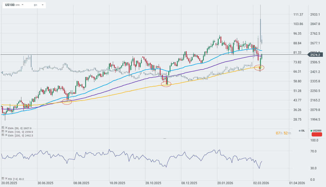 Pela terceira vez nos últimos 10 meses, o US100 está a defender a zona da MME de 200 dias, e o impulso ascendente de hoje está a empurrar o contrato acima da MME de 100 dias. A médio prazo, isso significa que a tendência ascendente definida por essas curvas permanece intacta. O petróleo será fundamental para as negociações futuras do US100, uma vez que é o principal fator que reflete os receios sobre o conflito em curso no Golfo Pérsico. O gráfico abaixo mostra a correlação inversa entre o US100 e o petróleo observada nos últimos dias.