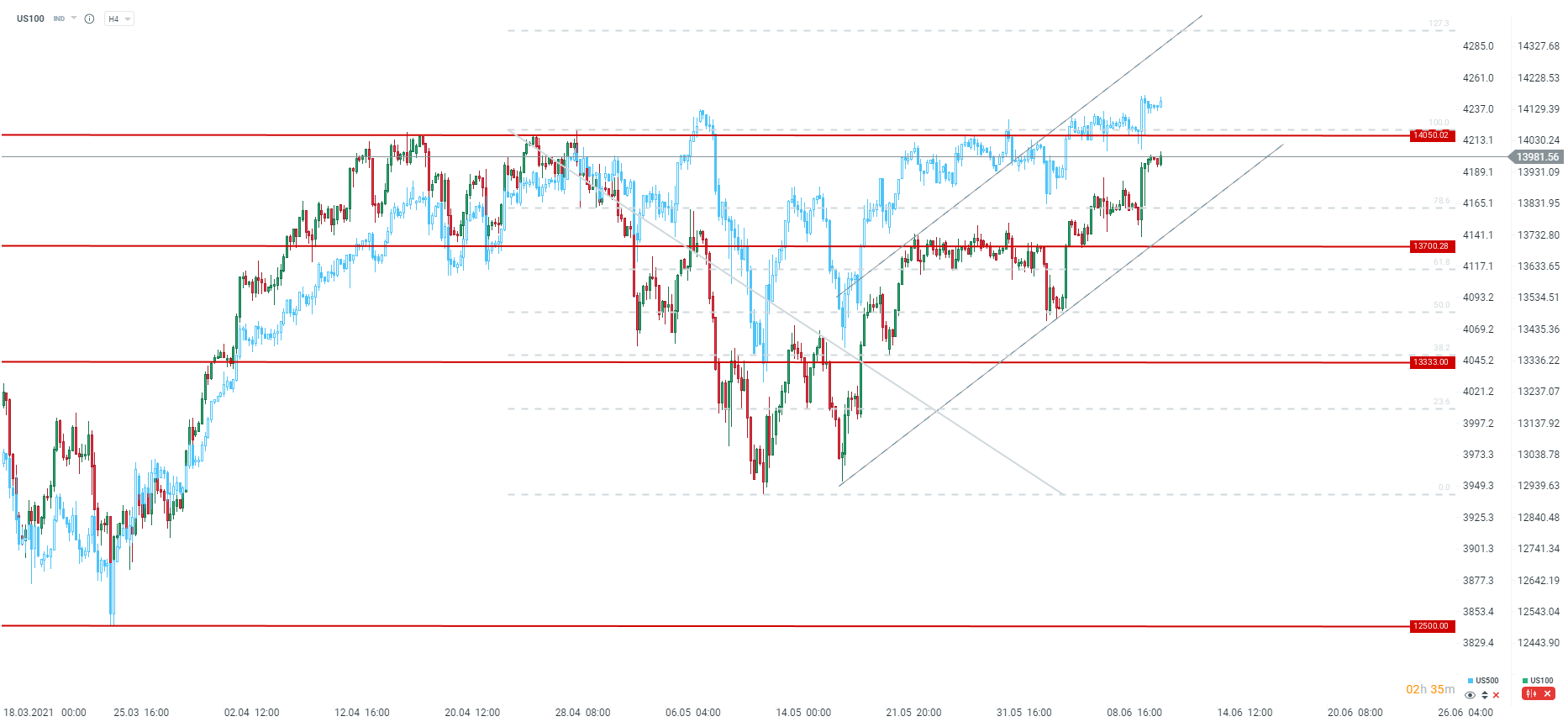 Os principais índices norte-americanos e europeus seguem em terreno positivo durante a sessão de hoje. Apesar dos recentes dados sobre os níveis de inflação nos EUA, os investidores não parecem preocupados e a reação do mercado tem sido francamente positiva. Os futuros do Nasdaq-100 (US100) estão a valorizar cerca de 0,2% durante a sessão de hoje. O índice encontra-se a ser negociado no nível mais alto desde 29 de abril e a cerca de 0,5% abaixo dos seus máximos históricos. Além disso, se a vela de 4 horas fechar perto dos níveis atuais, surgirá um padrão de velas que poderá indicar que a tendência de alta possa continuar. Outros índices norte-americanos, como o S&P 500, atingiram máximos históricos durante o dia de ontem.