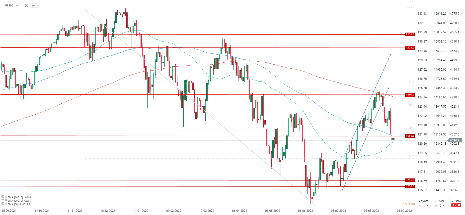 O S&P 500 (US500) apaga completamente o seu ressalto anterior e cai perto do fecho de ontem. O S&P 500 está abaixo dos 4050 pontos e da média de 100 períodos. O S&P 500 tem vindo a cair fortemente nos últimos minutos após terem surgido notícias de que Taiwan decidiu disparar tiros de aviso contra um drone chinês que se encontrava nas proximidades do espaço aéreo de Taiwan. É claro que tal situação não significa necessariamente nada, mas ao mesmo tempo não conduzirá a uma melhoria da situação no Leste.