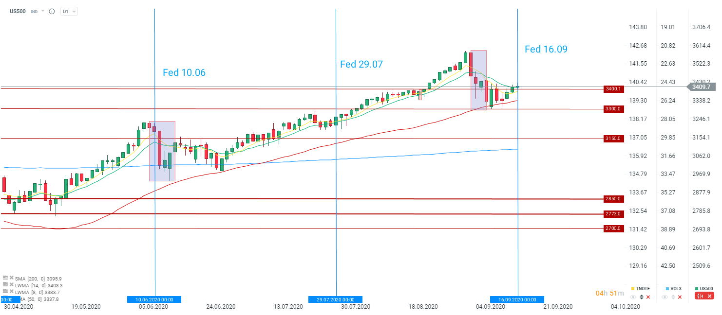 O S&P 500 acabou por anular os ganhos do dia de hoje antes da decisão do Fed. Durante a sessão de hoje, a volatilidade acabou por ser moderada. Fonte: xStation5