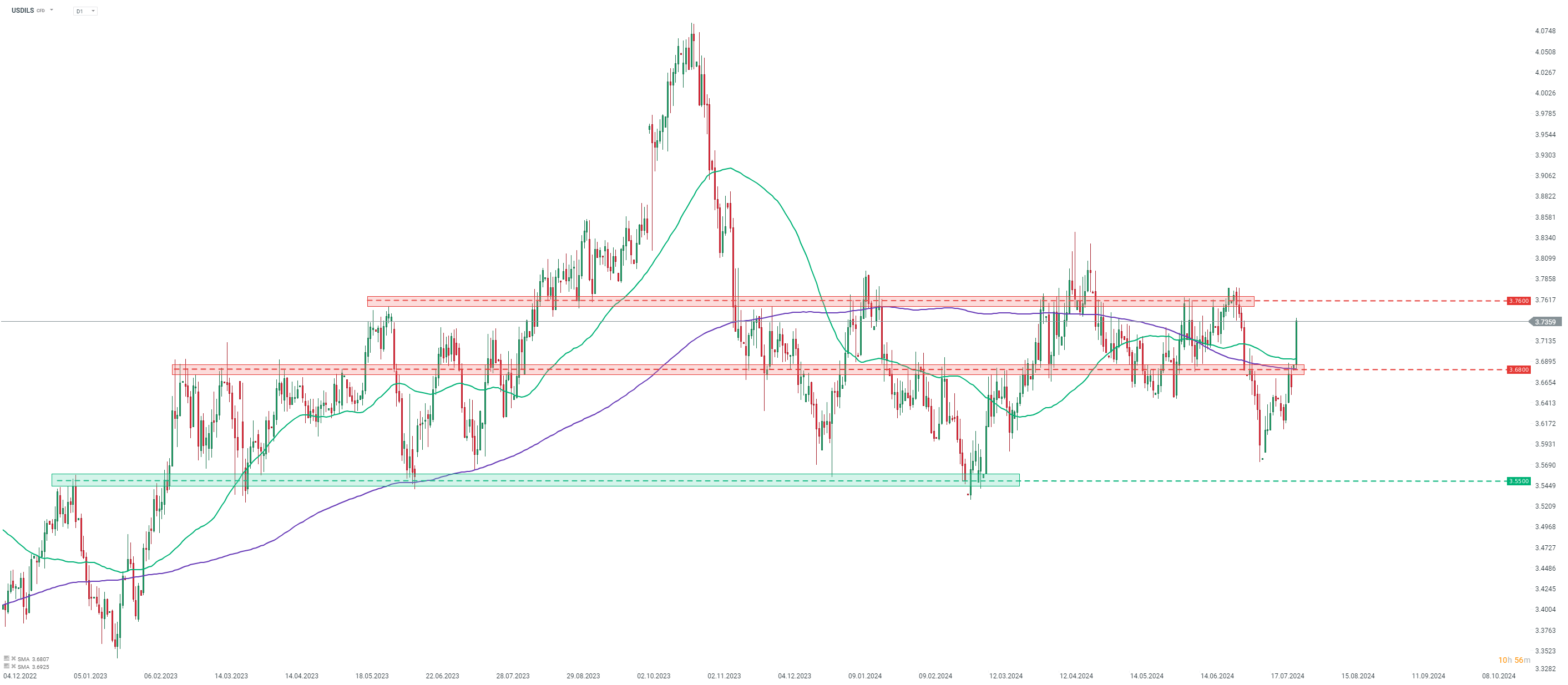 O USDILS está a ser negociado quase 2% acima do fecho de sexta-feira e atingiu níveis não vistos desde o início de julho. Dando uma olhada no gráfico no intervalo D1, podemos ver que o par saltou acima da zona de resistência de 3,6800, marcada com as reações de preços anteriores e a média móvel de 200 sessões (linha roxa), e continuou a subir. Uma zona de resistência de curto prazo a ser observada pode ser encontrada na área de 3,7600.