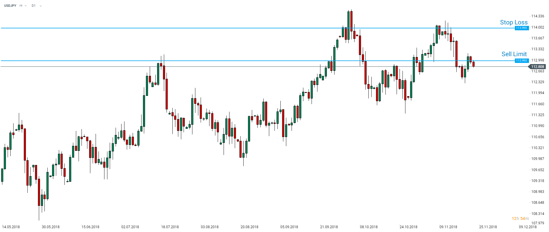 Thomson Reuters IFR recommenda posições de venda no par USDJPY com uma ordem limit nos 112.99 e stop loss order nos 113.99. O target deste trade não foi especificado. Fonte: xStation5