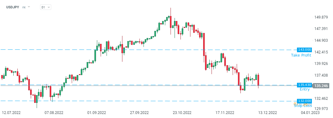 Goldman Sachs recomenda assumir uma posição longa em USDJPY em 135,43 com uma meta de 143,00 e uma ordem de stop loss colocada em 132,00. Fonte: xStation5