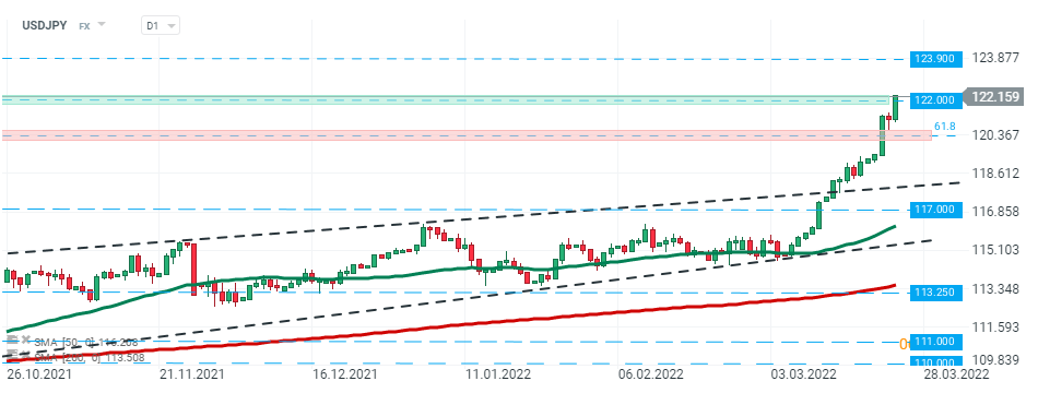 O par USDJPY conseguiu ultrapassar a barreira psicológica dos 122,00. Se o sentimento atual prevalecer, não podemos excluir a possibilidade de um novo movimento em direção à marca dos 123,90. Fonte: xStation5