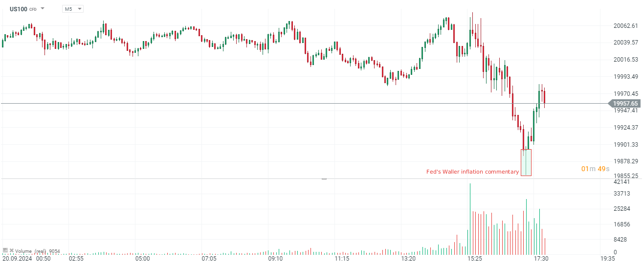 Os índices de Wall Street e os futuros de taxas de juro de curto prazo dos EUA registam ganhos depois de Christopher Waller, da Reserva Federal, ter assinalado o risco de a inflação dos EUA descer demasiado. Após este comentário, podemos ver um aumento das apostas em cortes ainda maiores nas taxas do Fed. De acordo com Waller, é claro que o corte de 50 bps foi a escolha certa. Waller também comentou que a queda dos números da inflação começa a piorar a Reserva Federal sobre as condições económicas dos EUA.