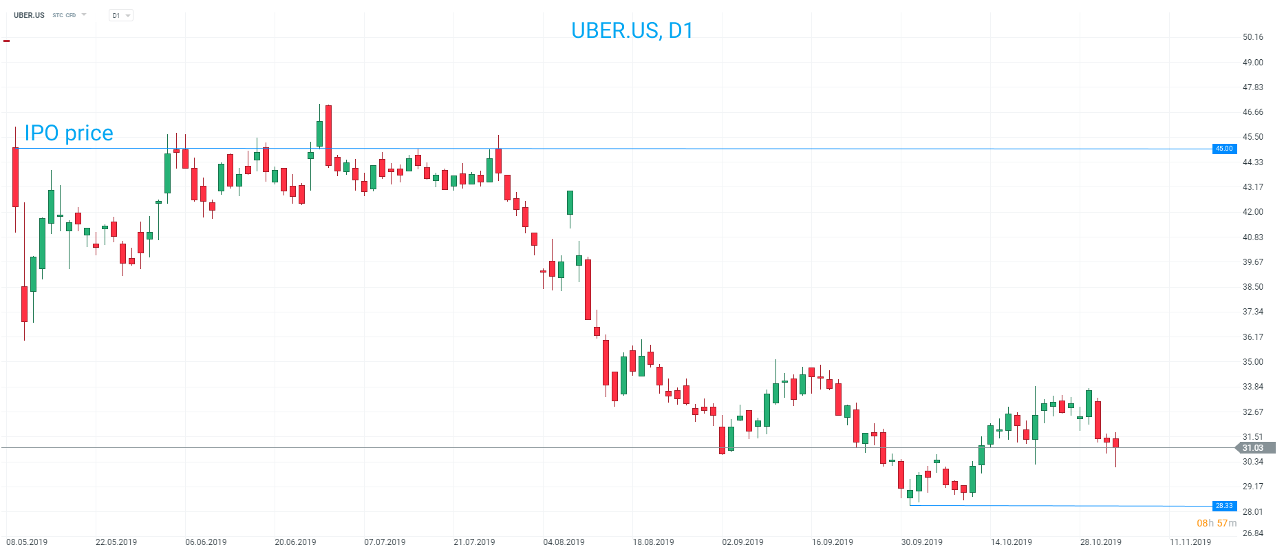 As ações do Uber deverão cair acentuadamente esta tarde após a atualização dos ganhos e não muito longe do seu nível mais baixo de sempre, de 28,33. As ações entraram em queda após um preço de IPO de 45,00 e, com operíodo de bloqueio a caducar amanhã, tudo indica que poderá haver vendas adicionais que baixarão o preço ainda mais. Fonte: xStation