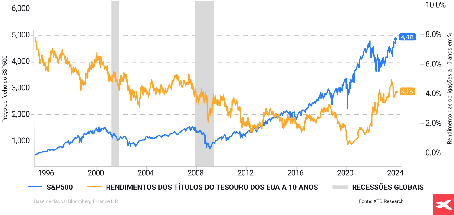 Rendimentos dos títulos do Tesouro dos EUA a 10 anos vs. desempenho do S&P 500 desde 1995 até 2024. Fonte: XTB Research, Bloomberg Finance LP