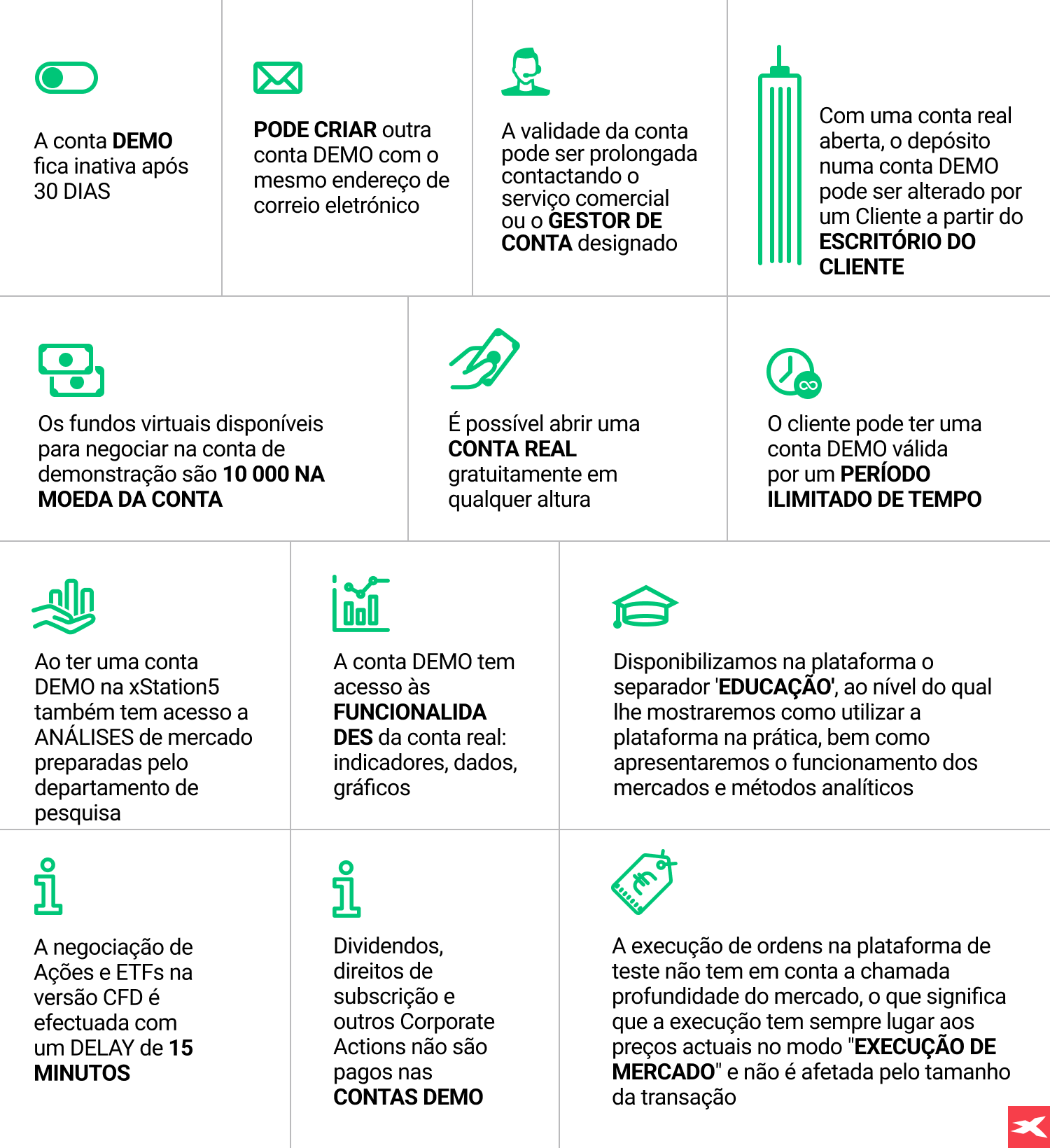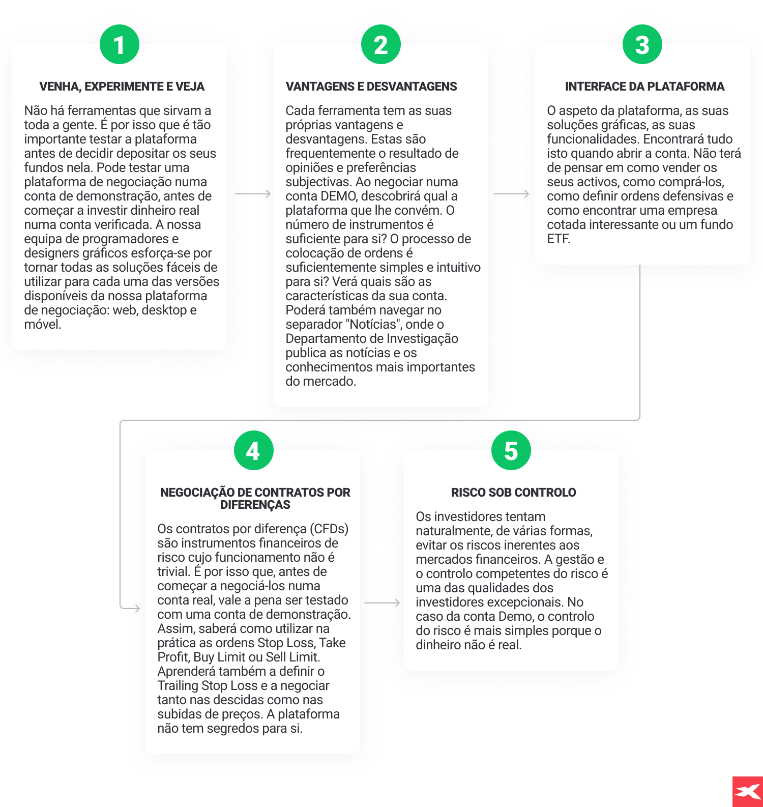Com uma conta DEMO, pode familiarizar-se com uma oferta que inclui milhares de instrumentos e começar a negociá-los virtualmente. Alguns instrumentos estão disponíveis para negociação exclusivamente com alavancagem (CFDs), enquanto outros estão disponíveis na versão tradicional sem alavancagem financeira (ações e ETFs). A oferta de CFDs inclui: Índices, Forex, Matérias-primas, Metais Preciosos, Criptomoedas, CFDs de Acções e CFDs de ETFs. Os instrumentos não CFD incluem ações e ETFs, e são negociados sem alavancagem. Lembre-se, numa conta DEMO, todas as perdas e lucros que obtiver são uma “simulação”.