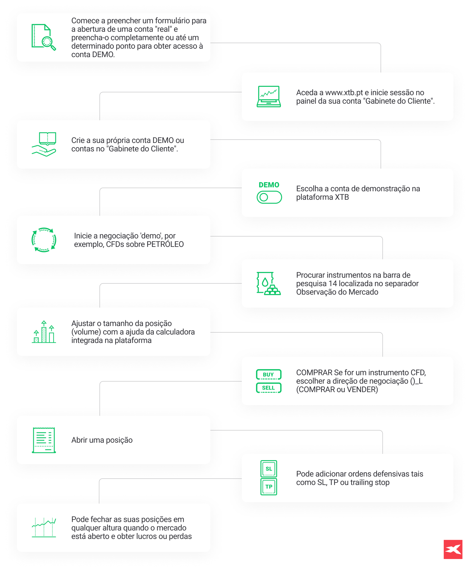 Para ter acesso a uma conta DEMO, é necessário iniciar um processo de registo através de um formulário real. A conta será aberta automaticamente e ligada ao seu endereço de correio eletrónico. Pode entrar na conta de DEMONSTRAÇÃO a partir do site da XTB.