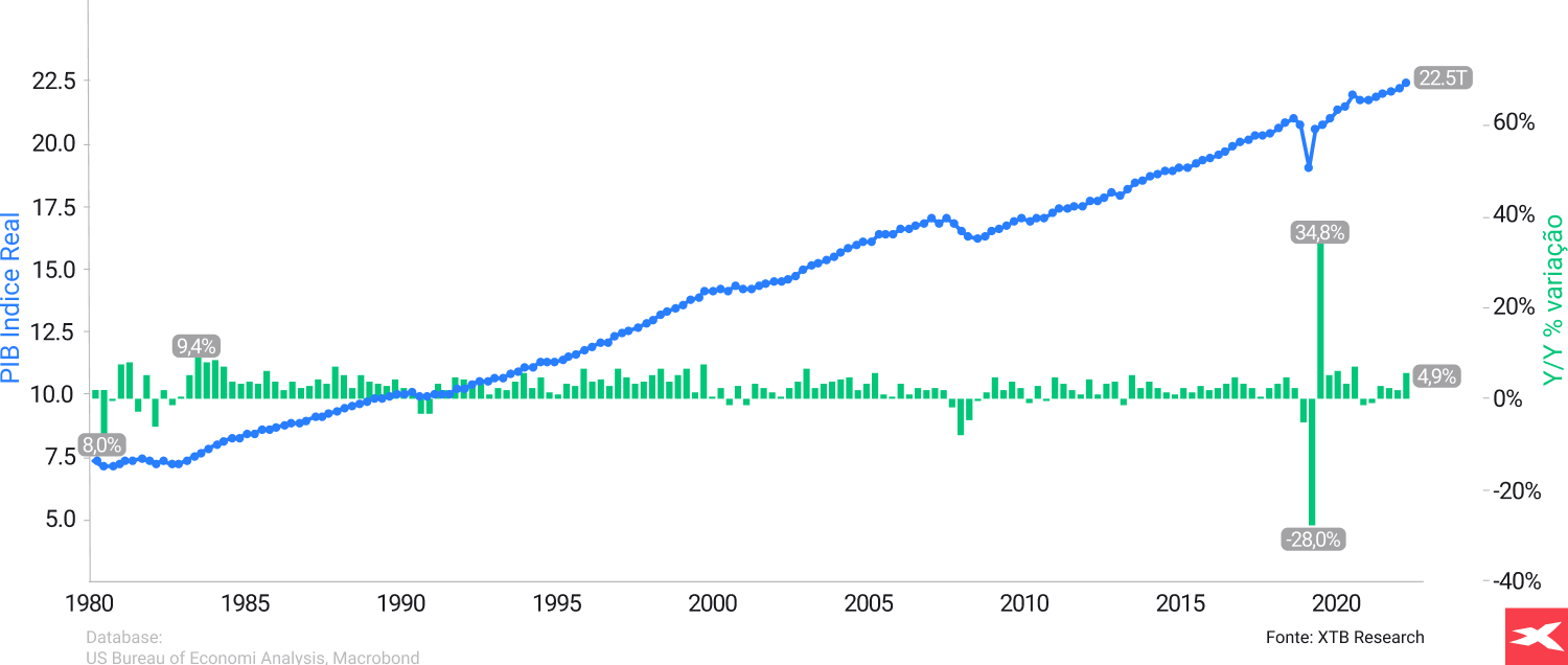 A longo prazo, o mercado de ações está correlacionado com o crescimento económico. Como podemos ver acima, o PIB dos EUA está a aumentar desde a década de 1980, com um ritmo extraordinário. Uma economia forte significa consumidores saudáveis com rendimentos mais elevados, o que é um fator positivo para as margens e os lucros das empresas. Apesar disso, devido à ciclicidade e a acontecimentos imprevisíveis, por vezes as ações têm um desempenho inferior e os sentimentos são muito baixos. Fonte: XTB Research