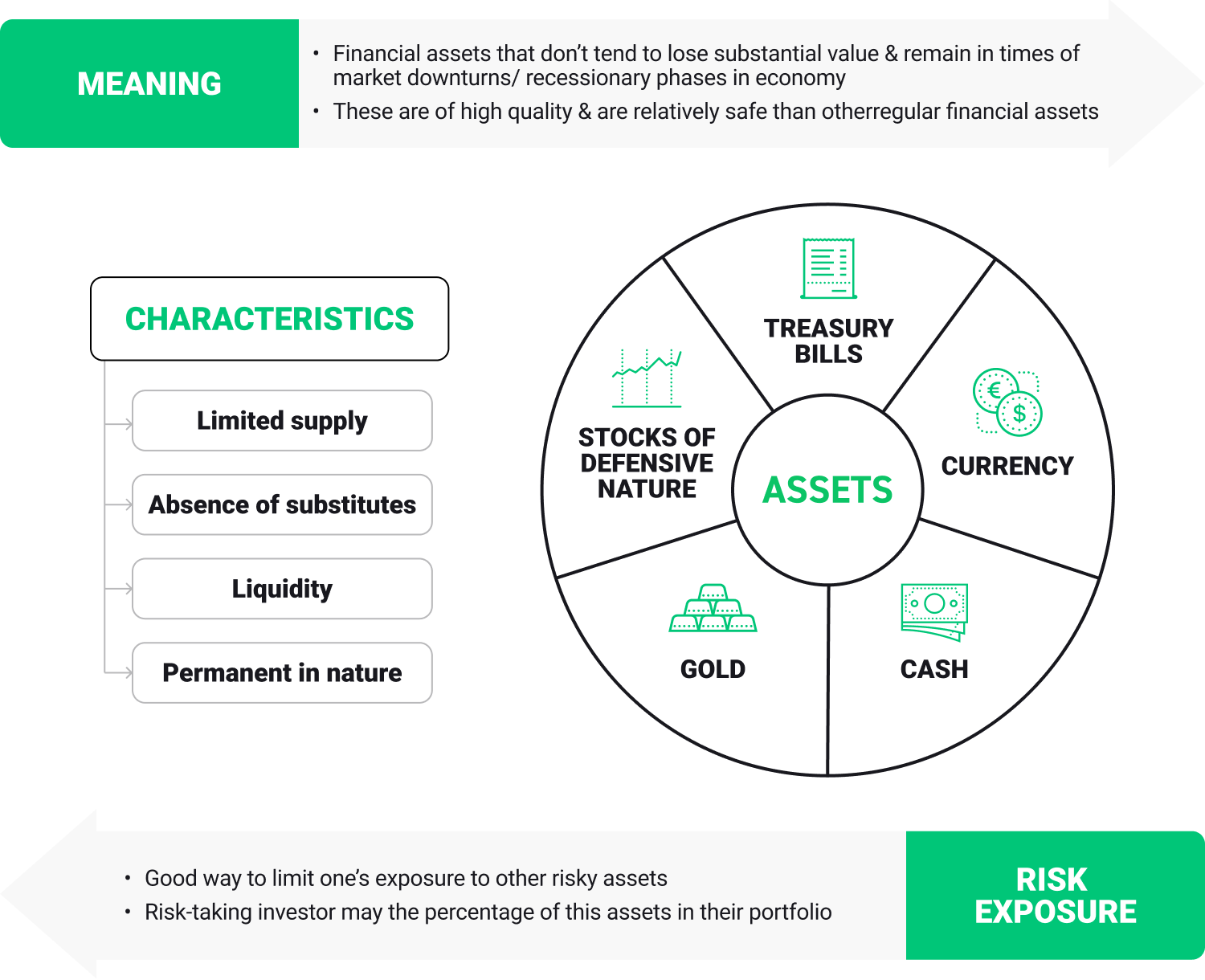 Os ativos referidos pelo mercado como refúgio seguro são ativos que podem revelar-se não correlacionados ou negativamente correlacionados com a condição da economia global ou com o aumento da inflação. Em termos simples, isto significa que os índices bolsistas podem cair, a economia pode ser abalada pela inflação, e estes ativos continuarão a permitir uma taxa de retorno ou, pelo menos, a reduzir a escala de eventuais perdas. No entanto, nada é certo no mercado e cada crise é, de alguma forma, diferente da anterior. No entanto, há ativos que podem revelar-se "mais resistentes" à turbulência do mercado e à inflação elevada. Estes ativos são considerados mais seguros do que a média do mercado.