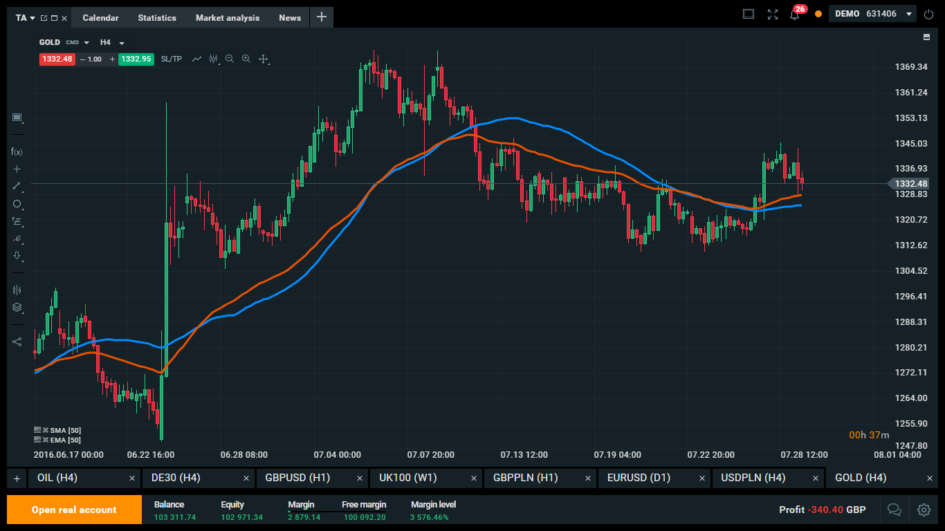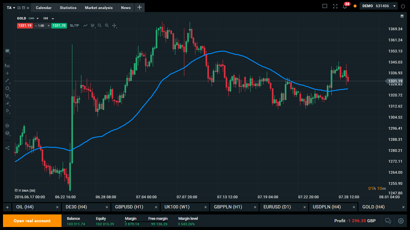 No exemplo acima, uma MMS de 50 períodos foi aplicada ao mercado do Ouro. Como pode ver, primeiro o mercado indicou um sinal de compra e só depois se valorizou. Mais tarde, o mercado intersectou a linha da MMS a partir de cima, constituindo assim um sinal de venda, após o qual o mercado se desvalorizou.