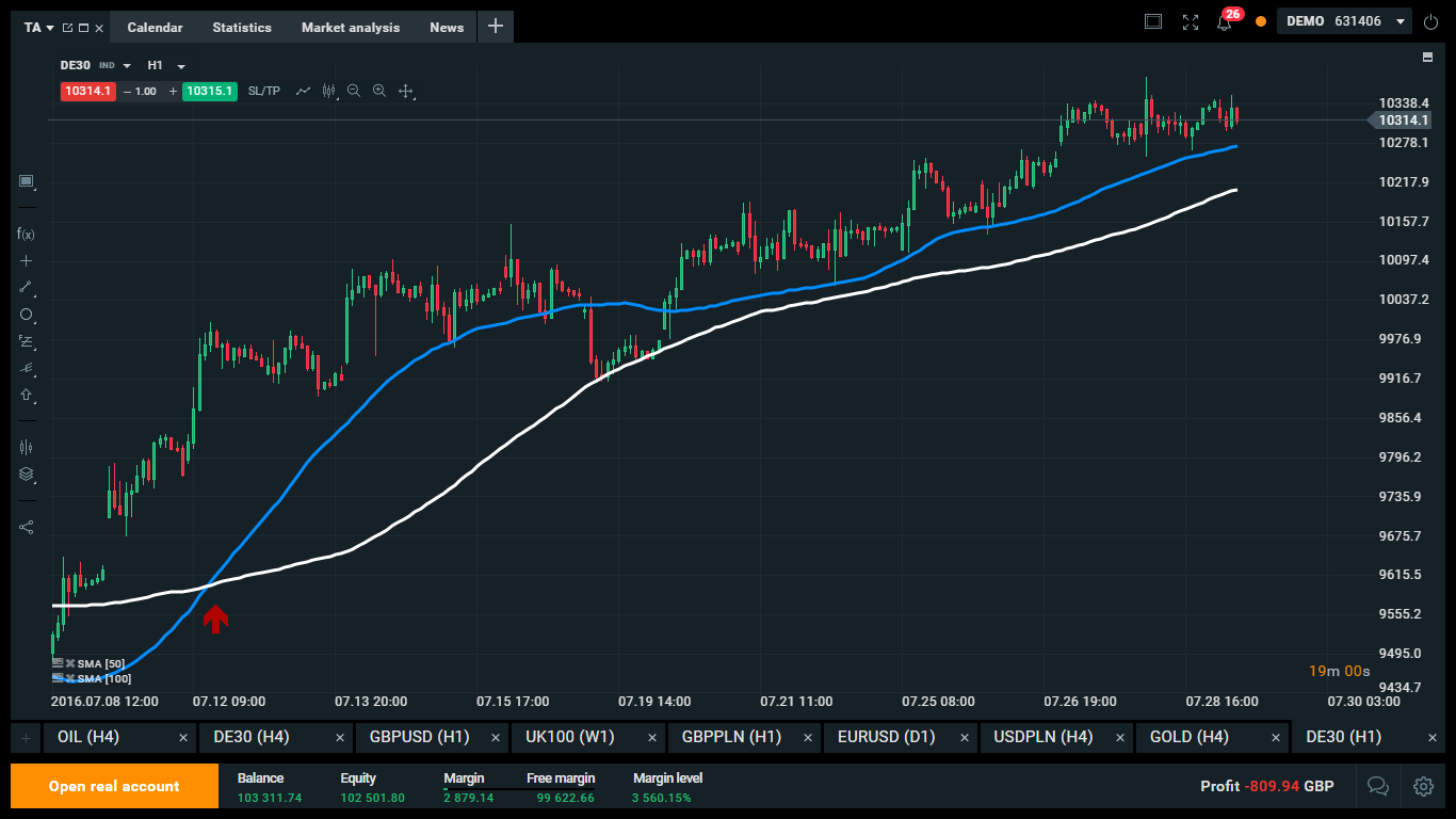 No exemplo acima, uma MMS de 50 períodos (linha azul) e uma MMS de 100 períodos (linha branca) foram introduzidas no gráfico DE30. Assim que a MMS de 50 períodos intersectou, a partir de baixo, a MMS de 100 períodos, foi criado um sinal de venda, após o qual o mercado se valorizou.