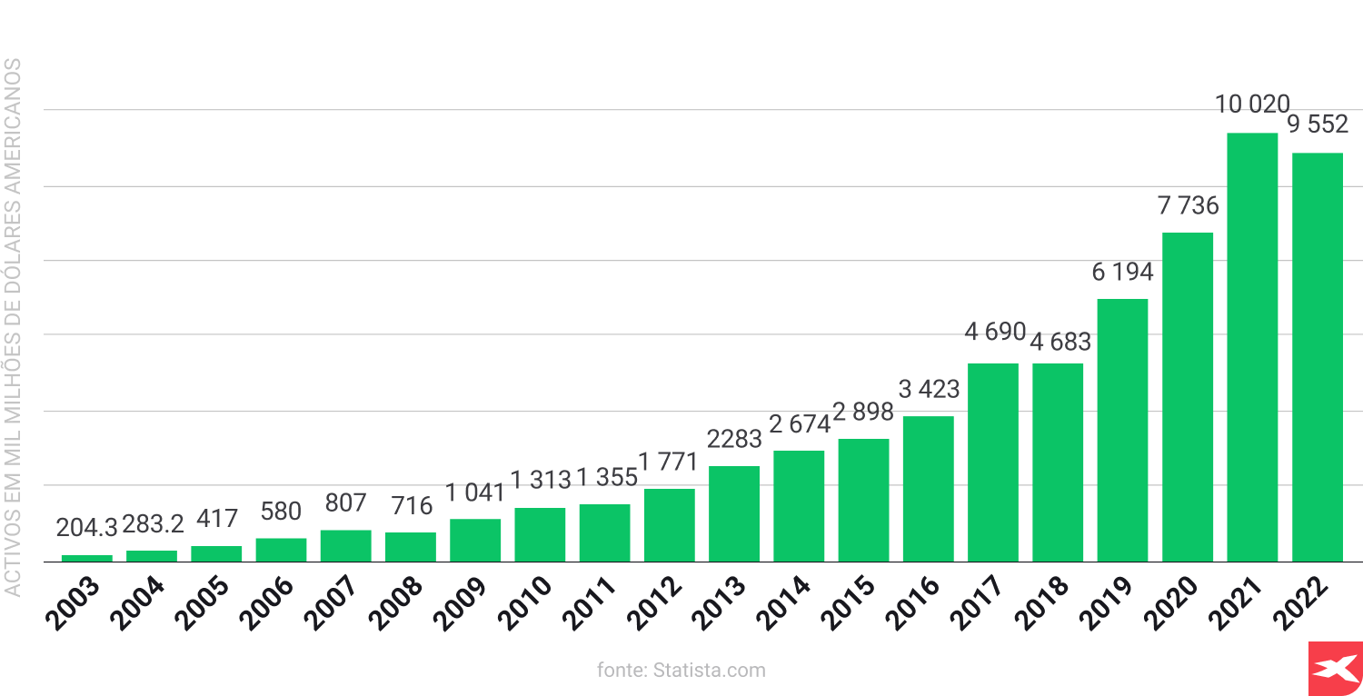 O investimento em ETF tornou-se um investimento popular devido à possibilidade de investimento passivo (especialmente fundos de índice como o S&P 500 ou o Nasdaq). O dinheiro investido em ETF está a crescer constantemente, passando de 204 mil milhões de dólares em 2003 para 9,55 biliões de dólares em 2022. Fonte: Statista