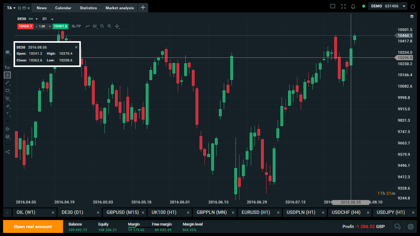 Após escolher o cursor de cruz ou mira deverá deslocá-lo para cima da barra de vela que deseja analisar. No exemplo acima o cursor foi usado no mercado DE30 e colocado sobre a barra de vela diária do dia 5 de Agosto de 2016.