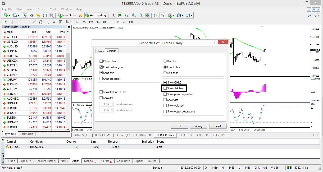 Para definir o preço de venda no gráfico, deverá pressionar a tecla F8 no seu teclado. Esta acção abrirá a janela de configuração dos gráficos, devendo seleccionar aqui a opção “Mostrar Linha de Preço de Venda” (“Show Ask Line”) no menu ‘Comum’. O preço ficará então visível no gráfico.