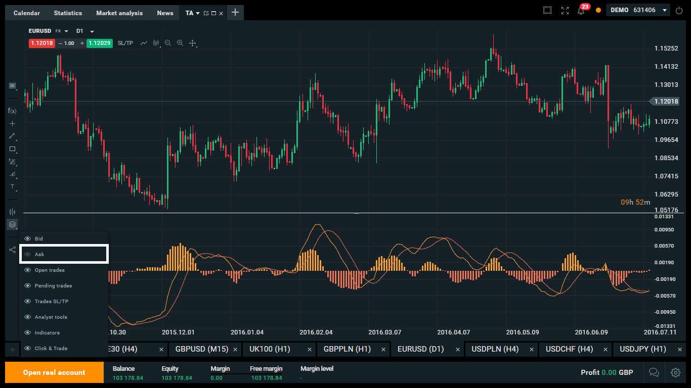 De modo a definir um preço de venda no gráfico, deverá primeiro premir o botão “Camadas visíveis” (“visible layers”) na parte direita do gráfico, e seleccionar de seguida a opção “Ask”. Assim que completar este passo o preço de venda ficará visível no gráfico.