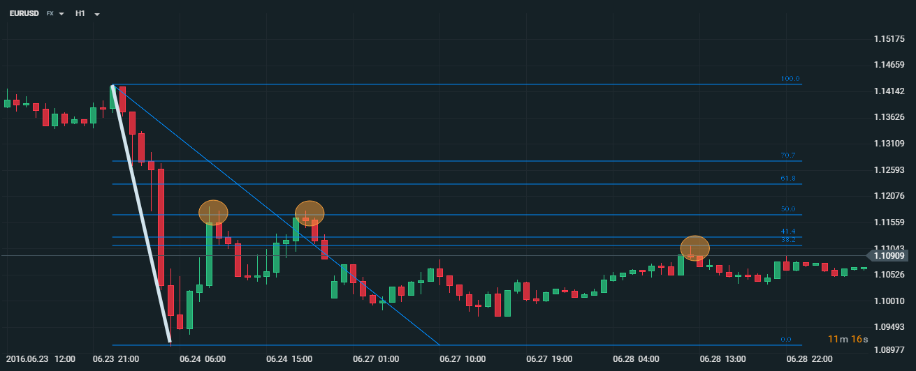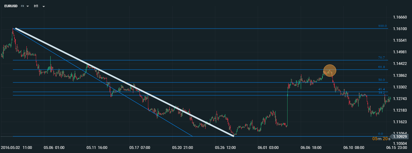 No exemplo acima, o mercado começou por entrar numa dinâmica decrescente, após a qual se voltou a valorizar, atingindo por duas vezes o nível equivalente a 50% da queda inicial e mais tarde o nível de 38.2%. Este exemplo é bem ilustrativo de uma situação em que o mercado não conseguiu quebrar, em três ocasiões, os níveis de resistência.