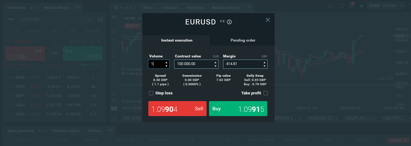 Se usa a plataforma MT4, o valor monetário do spread será calculado da forma descrita acima. Em comparação com o MT4, uma das vantagens do xStation é a incorporação de uma calculadora avançada de negociação, que calcula instantaneamente o custo do spread consoante o volume da transacção. No exemplo que mostramos em baixo, uma transacção de 1 lote sobre o par EURUSD apresenta um spread de 1.1 pips, equivalente a um valor monetário de £8.38.