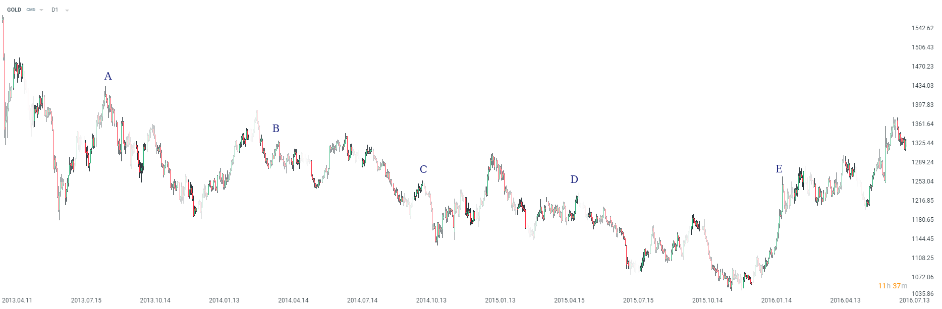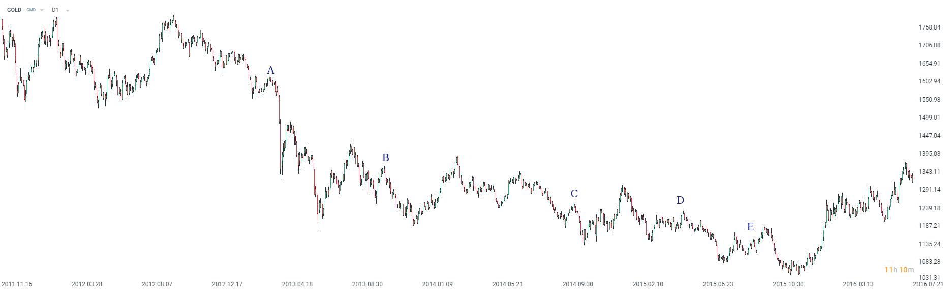 Agora que sabe as vantagens e desvantagens de entrar em fases, vejamos como funciona na prática. Vamos olhar para o gráfico diário do Ouro e imaginar que decide vender dois lotes a 1450 (A). Depois, o mercado moveu-se na direção esperada e, por isso, decide adicionar essa correção à sua posição (B). Depois, como o movimento descendente se fortaleceu, adicionou a terceira parte da negociação (C e D). A exposição inicial foi de dois lotes, mas acabou por ser quatro vezes maior.
