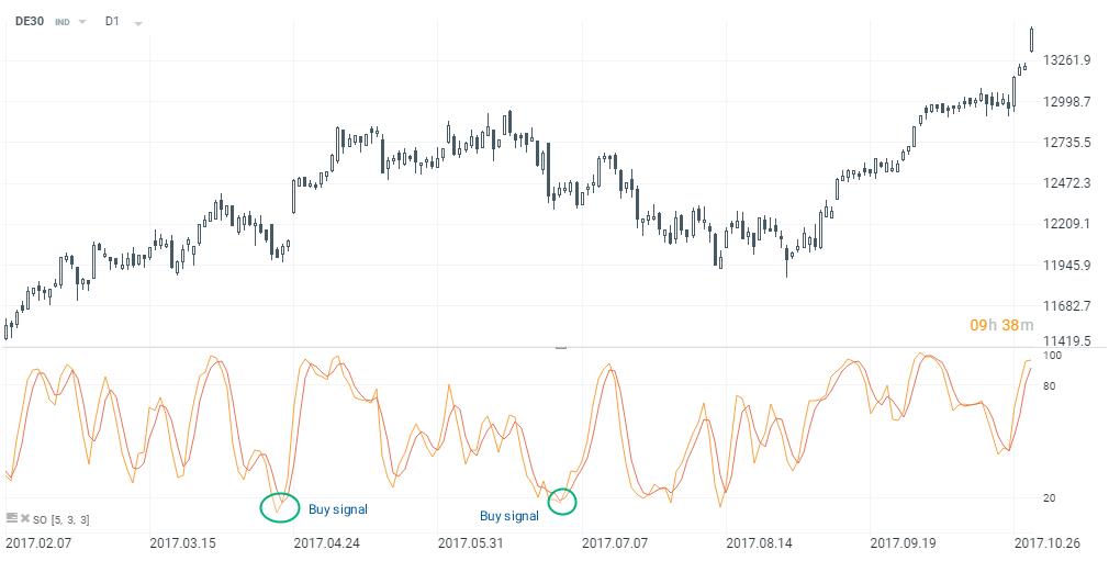 A ideia de negociar recorrendo ao indicador estocástico assemelha-se ao seguinte: quando o preço desce, entre numa posição curta quando o indicador tiver sido comprado em excesso e tiver descido abaixo de 50. Quando estiver a aumentar, compre quando o preço estiver vendido em excesso e subir acima da linha neutra. O nível 50 é usado mais usualmente e visto como a linha neutra, e por isso aparece no nosso exemplo.