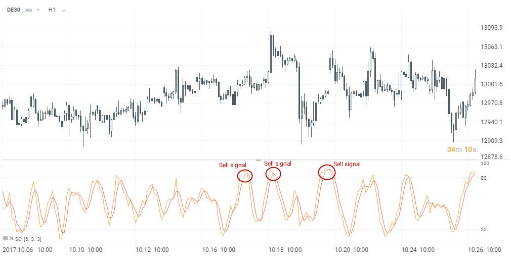 Por outro lado, o sinal de venda aparece quando a linha mais rápida se cruza com a mais lenta na parte ascendente da zona de compras em excesso e quando ambas ficam abaixo do nível 80.