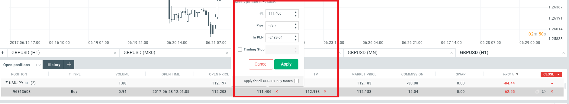 A segunda forma é ainda mais rápida. Só tem de especificar os níveis que pretende a partir do terminal. Basta clicar no botão “+” numa das colunas de SL ou TP e introduzir os níveis que pretende. Como vê, é muito simples e torna-se útil quando precisa de tomar rápidas decisões de trading.