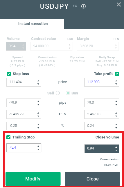 A Trailing Stop é uma ordem que pode ser facilmente desativada: basta clicar na caixa de trailing stop no módulo de modificação da transação.