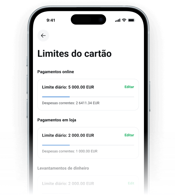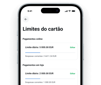 Controle eficazmente os seus gastos e defina limites para transferências, levantamentos ou pagamentos com cartão.