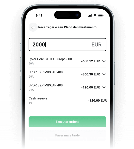 Carregue a sua conta regularmente e invista automaticamente com o Investimento Automáticos. Basta selecionar um montante, período e método de depósito específicos e os seus fundos serão sistematicamente investidos em ETFs à sua escolha, de acordo com a estrutura do seu Plano.