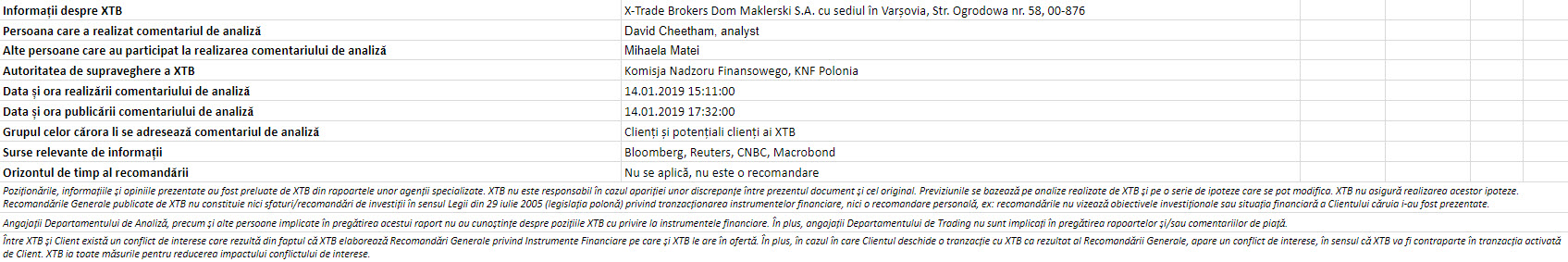 "Acest material este o comunicare de marketing în sensul articolului 24 alineatul (3) din Directiva 2014/65 / UE a Parlamentului European și a Consiliului din 15 mai 2014 privind piețele de instrumente financiare, și de modificare a Directivei 2002/92 / CE și a Directivei 2011 / 61 / UE (MiFID II). Comunicarea de marketing nu este o recomandare de investiții sau o recomandare de informații sau o recomandare care sugerează o strategie de investiții în sensul Regulamentului (UE) nr. 596/2014 al Parlamentului European și al Consiliului din 16 aprilie 2014 privind abuzul de piață ( reglementarea abuzului de piață) și de abrogare a Directivei 2003/6 / CE a Parlamentului European și a Consiliului și a Directivelor Comisiei 2003/124 / CE, 2003/125 / CE și 2004/72 / CE și a Regulamentului delegat (UE) 2016/958 al Comisiei din 9 596/2014 al Parlamentului European și al Consiliului în ceea ce privește standardele tehnice de reglementare pentru aranjamentele tehnice pentru prezentarea obiectivă a recomandărilor de investiții sau a altor informații care sugerează strategii de investiții și pentru dezvăluirea de interese particulare sau indicații de conflicte de interese sau orice alte sfaturi, inclusiv în domeniul consultanței în materie de investiții, în sensul Legii privind tranzacționarea cu instrumente financiare din 29 iulie 2005 (de ex. Journal of Laws 2019, articolul 875, astfel cum a fost modificat). Comunicarea de marketing este pregătită cu cea mai mare diligență, obiectivitate, prezintă faptele cunoscute autorului la data pregătirii și este lipsită de orice elemente de evaluare. Comunicarea de marketing este pregătită fără a lua în considerare nevoile clientului, situația sa financiară individuală și nu prezintă nicio strategie de investiții în niciun fel. Comunicarea de marketing nu constituie o ofertă de vânzare, oferire, abonament, invitație la cumpărare, reclamă sau promovare a oricărui instrument financiar. XTB SA nu este responsabilă pentru acțiunile sau omisiunile niciunui client, în special pentru achiziționarea sau cedarea instrumente, întreprinse pe baza informațiilor conținute în această comunicare de marketing. XTB SA nu va accepta răspunderea pentru nicio pierdere sau daună, inclusiv, fără limitare, orice pierdere care poate apărea direct sau indirect, efectuată pe baza informațiilor conținute în această comunicare de marketing. În cazul în care comunicarea de marketing conține informații despre orice rezultat cu privire la instrumentele financiare indicate în acestea, acestea nu constituie nicio garanție sau prognoză cu privire la rezultatele viitoare. Performanțele anterioare nu indică neapărat rezultatele viitoare și orice persoană care acționează pe baza acestor informații o face pe propriul risc. Acest material nu este emis pentru a influenta deciziile de tranzacționare ale niciunei persoane. Informațiile cuprinse în cadrul acestui material nu sunt prezentate pentru a fi aplicate, copiate sau testate în cadrul tranzacțiilor dumneavoastră. Informațiile cuprinse în cadrul acestui material sunt emise în baza experienței proprii a emitentului și nu reprezintă o recomandare individuală, nu vizează atingerea anumitor obiective, randamente financiare și nu se adresează nevoilor niciunei persoane anume care ar primi-o. Premisele acestui material nu au în vedere situația și persoana dumneavoastră deci nu recomandăm utilizarea acestor informații sub orice formă. Utilizarea informațiilor cuprinse în cadrul acestui material în orice modalitate se face pe propria dumneavoastră răspundere. Acest material este emis de către un analist pentru care își asumă răspunderea XTB SA, persoană juridică autorizată de KNF – Autoritatea de Supraveghere Financiara din Polonia."