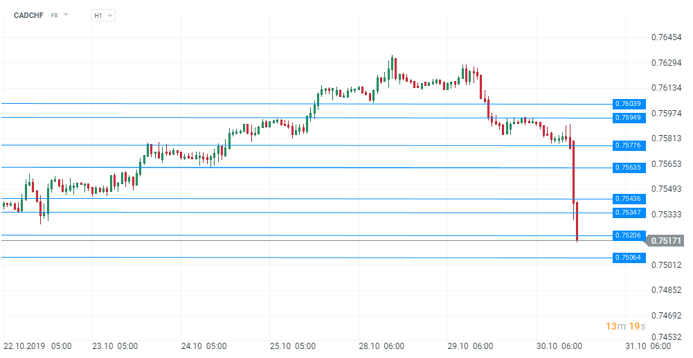 În această situație, dolarul canadian pierde teren în raport cu majoritatea monedelor. Cea mai accentuată depreciere este înregistrată în raport cu francul elvețian. Perechea CADCHF pierde aproximativ 0,98% la momentul scrierii, spărgând mai multe niveluri de suport printre care 0,75776, 0,75635, 0,75436 și în acest moment evoluează în jurul barierei de la 0,75206. Ținând cont de o scădere a apetitului pentru risc a investitorilor este posibil ca această tendință să se mențină, fiind impulsionată de o creștere a cererii de CHF.