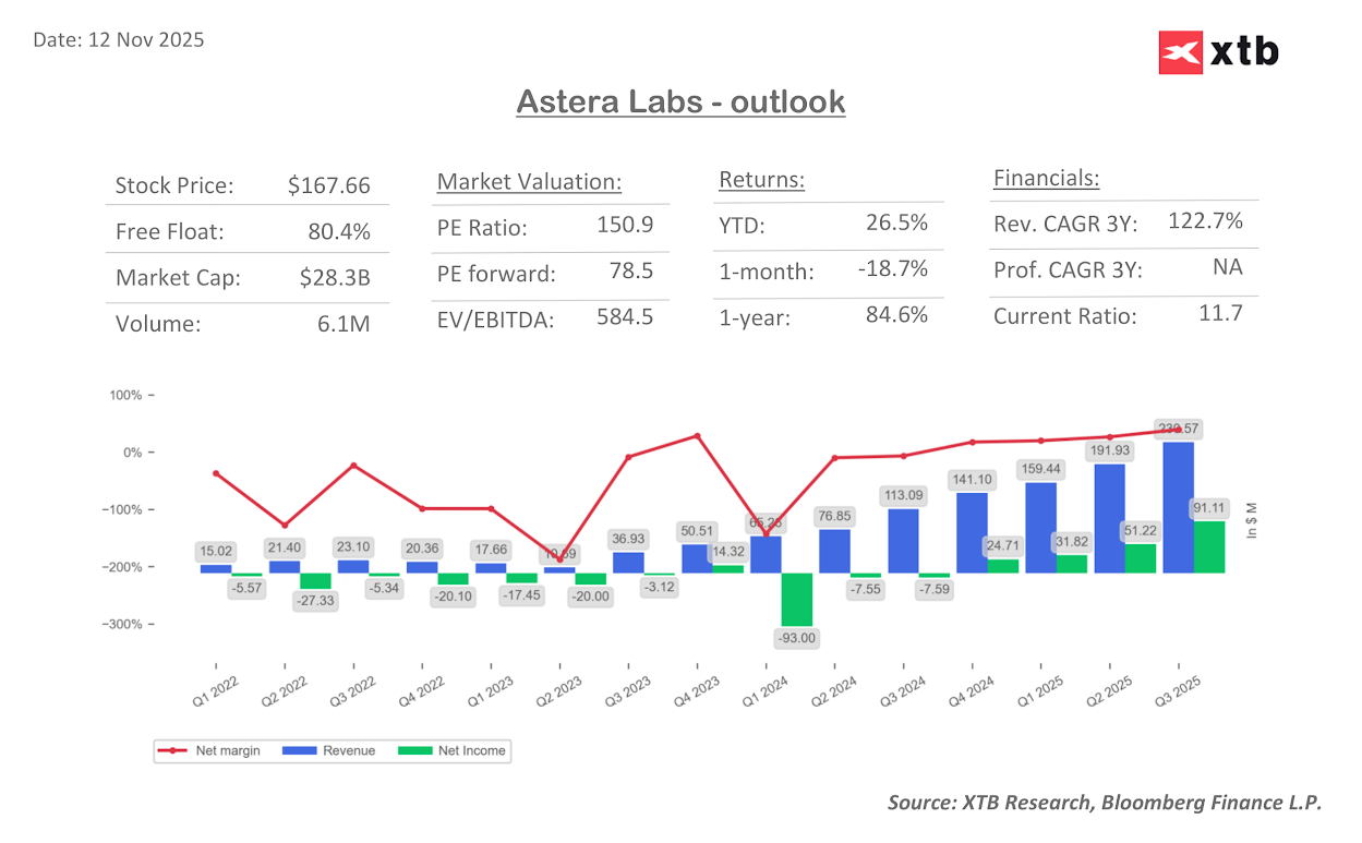 Bilanțul Astera rămâne puternic, cu 1,13 miliarde de dolari în numerar și datorii reduse, susținând continuarea cercetării și dezvoltării. Astera, în ciuda prețului ridicat, are o execuție impecabilă, o linie de produse diversificată și o poziție de lider în ecosistemele de rețele AI deschise, ceea ce o face unul dintre cei mai strategici jucători de pe piața infrastructurii AI.