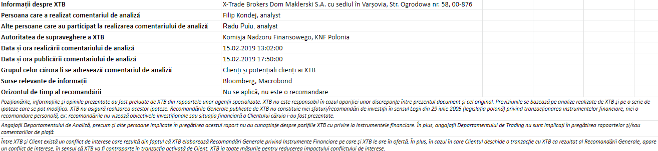 "Acest material este o comunicare de marketing în sensul articolului 24 alineatul (3) din Directiva 2014/65 / UE a Parlamentului European și a Consiliului din 15 mai 2014 privind piețele de instrumente financiare, și de modificare a Directivei 2002/92 / CE și a Directivei 2011 / 61 / UE (MiFID II). Comunicarea de marketing nu este o recomandare de investiții sau o recomandare de informații sau o recomandare care sugerează o strategie de investiții în sensul Regulamentului (UE) nr. 596/2014 al Parlamentului European și al Consiliului din 16 aprilie 2014 privind abuzul de piață ( reglementarea abuzului de piață) și de abrogare a Directivei 2003/6 / CE a Parlamentului European și a Consiliului și a Directivelor Comisiei 2003/124 / CE, 2003/125 / CE și 2004/72 / CE și a Regulamentului delegat (UE) 2016/958 al Comisiei din 9 596/2014 al Parlamentului European și al Consiliului în ceea ce privește standardele tehnice de reglementare pentru aranjamentele tehnice pentru prezentarea obiectivă a recomandărilor de investiții sau a altor informații care sugerează strategii de investiții și pentru dezvăluirea de interese particulare sau indicații de conflicte de interese sau orice alte sfaturi, inclusiv în domeniul consultanței în materie de investiții, în sensul Legii privind tranzacționarea cu instrumente financiare din 29 iulie 2005 (de ex. Journal of Laws 2019, articolul 875, astfel cum a fost modificat). Comunicarea de marketing este pregătită cu cea mai mare diligență, obiectivitate, prezintă faptele cunoscute autorului la data pregătirii și este lipsită de orice elemente de evaluare. Comunicarea de marketing este pregătită fără a lua în considerare nevoile clientului, situația sa financiară individuală și nu prezintă nicio strategie de investiții în niciun fel. Comunicarea de marketing nu constituie o ofertă de vânzare, oferire, abonament, invitație la cumpărare, reclamă sau promovare a oricărui instrument financiar. XTB SA nu este responsabilă pentru acțiunile sau omisiunile niciunui client, în special pentru achiziționarea sau cedarea instrumente, întreprinse pe baza informațiilor conținute în această comunicare de marketing. XTB SA nu va accepta răspunderea pentru nicio pierdere sau daună, inclusiv, fără limitare, orice pierdere care poate apărea direct sau indirect, efectuată pe baza informațiilor conținute în această comunicare de marketing. În cazul în care comunicarea de marketing conține informații despre orice rezultat cu privire la instrumentele financiare indicate în acestea, acestea nu constituie nicio garanție sau prognoză cu privire la rezultatele viitoare. Performanțele anterioare nu indică neapărat rezultatele viitoare și orice persoană care acționează pe baza acestor informații o face pe propriul risc. Acest material nu este emis pentru a influenta deciziile de tranzacționare ale niciunei persoane. Informațiile cuprinse în cadrul acestui material nu sunt prezentate pentru a fi aplicate, copiate sau testate în cadrul tranzacțiilor dumneavoastră. Informațiile cuprinse în cadrul acestui material sunt emise în baza experienței proprii a emitentului și nu reprezintă o recomandare individuală, nu vizează atingerea anumitor obiective, randamente financiare și nu se adresează nevoilor niciunei persoane anume care ar primi-o. Premisele acestui material nu au în vedere situația și persoana dumneavoastră deci nu recomandăm utilizarea acestor informații sub orice formă. Utilizarea informațiilor cuprinse în cadrul acestui material în orice modalitate se face pe propria dumneavoastră răspundere. Acest material este emis de către un analist pentru care își asumă răspunderea XTB SA, persoană juridică autorizată de KNF – Autoritatea de Supraveghere Financiara din Polonia."