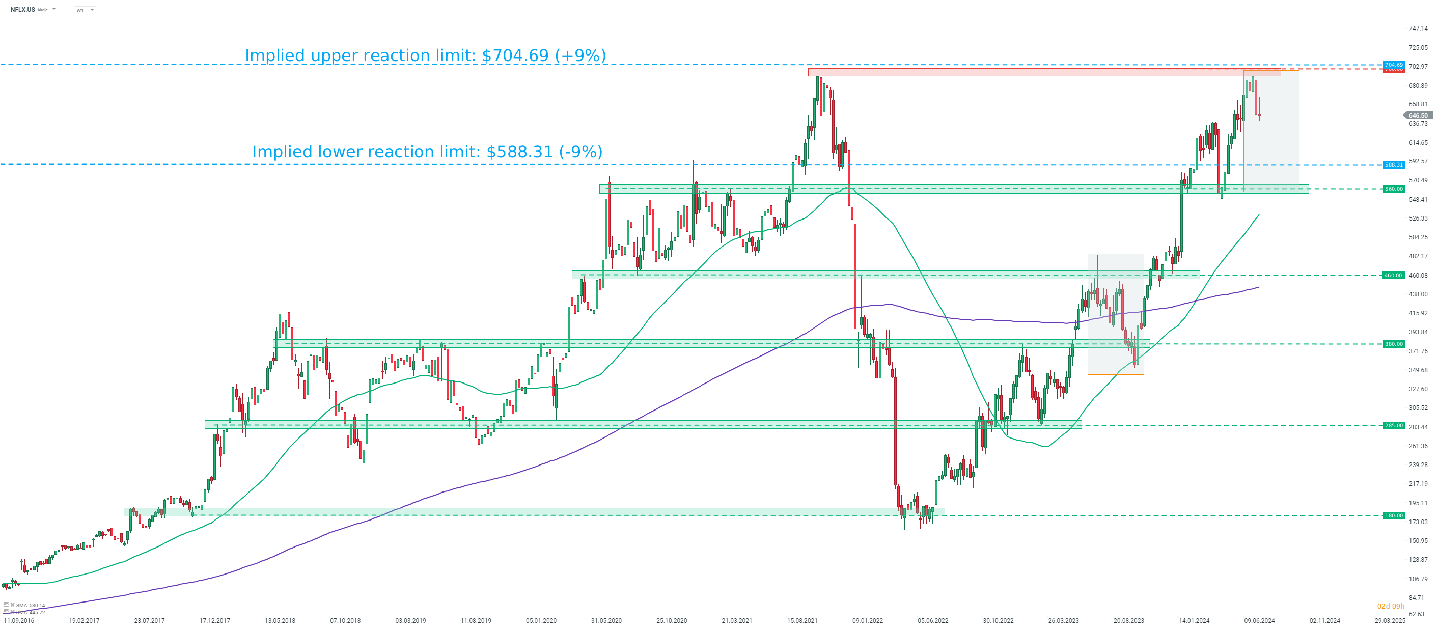 Graficul Netflix pe intervalul săptămânal care include intervalul de reacție post rentabilitate implicită a opțiunilor. Sursa: xStation 5