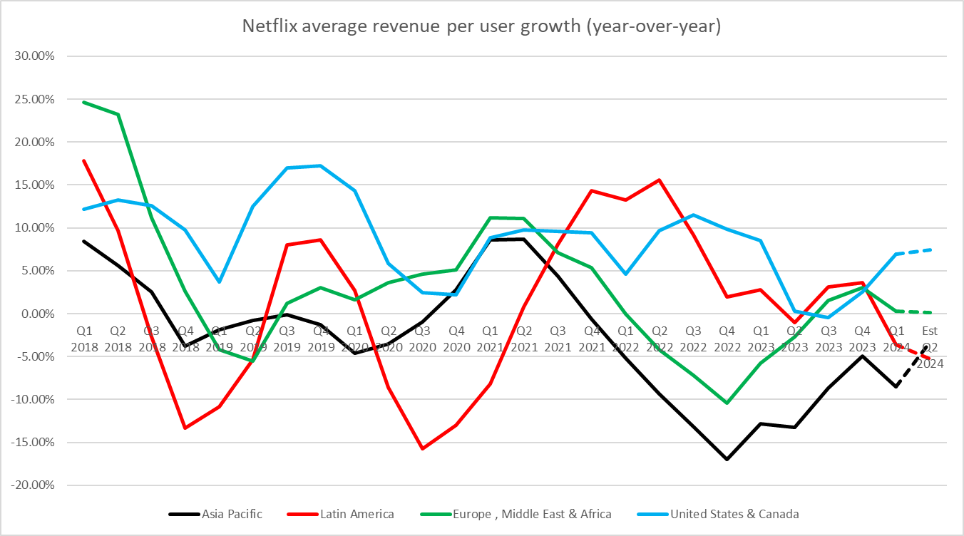 Se așteaptă ca Netflix să raporteze o creștere negativă a veniturilor per utilizator pentru Asia Pacific și America Latină, precum și o creștere stabilă în EMEA. Liniile punctate de pe grafic marchează previziunile pentru Q2 2024. Sursă: Bloomberg Finance LP, XTB Research