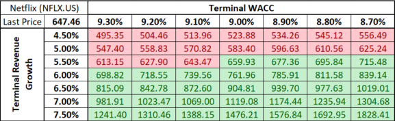 Un astfel de set de ipoteze ne oferă o valoare intrinsecă a acțiunilor Netflix de 761,96 $ - cu peste 17% peste prețul de închidere de ieri. Cu toate acestea, prognoza valorii terminale reprezintă aproximativ 88% din evaluarea DCF.