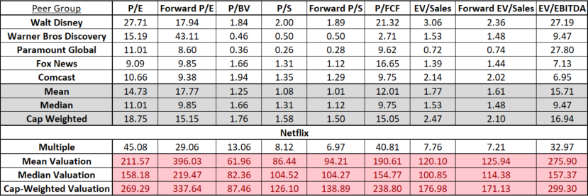 În continuare, am decis să aruncăm o privire la modul în care evaluarea Netflix se compară cu colegii săi. Am construit un grup de 5 companii - Walt Disney, Paramount Global, Warner Bros Discovery, Comcast și Fox Corp. Ne-am uitat la un număr de multipli de evaluare diferiți, inclusiv multipli de urmărire și de perspectivă.