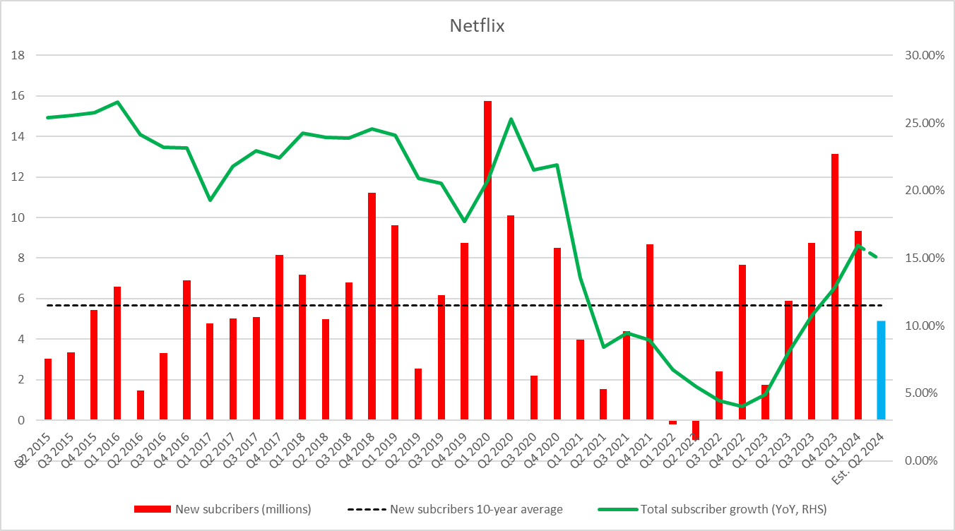 Așa cum se întâmplă de obicei cu Netflix, nu rezultatele principale vor atrage cea mai mare atenție, ci mai degrabă numărul de abonați. După cum am menționat deja, compania este de așteptat să raporteze un nou număr de abonați de aproximativ două ori mai mic decât în Q1 2024. Dacă așteptările sunt îndeplinite, creșterea sub 5 milioane ar marca cea mai mică expansiune din Q2 2023 și ar fi, de asemenea, mai slabă decât media pe 5 ani de aproximativ 5,7 milioane.